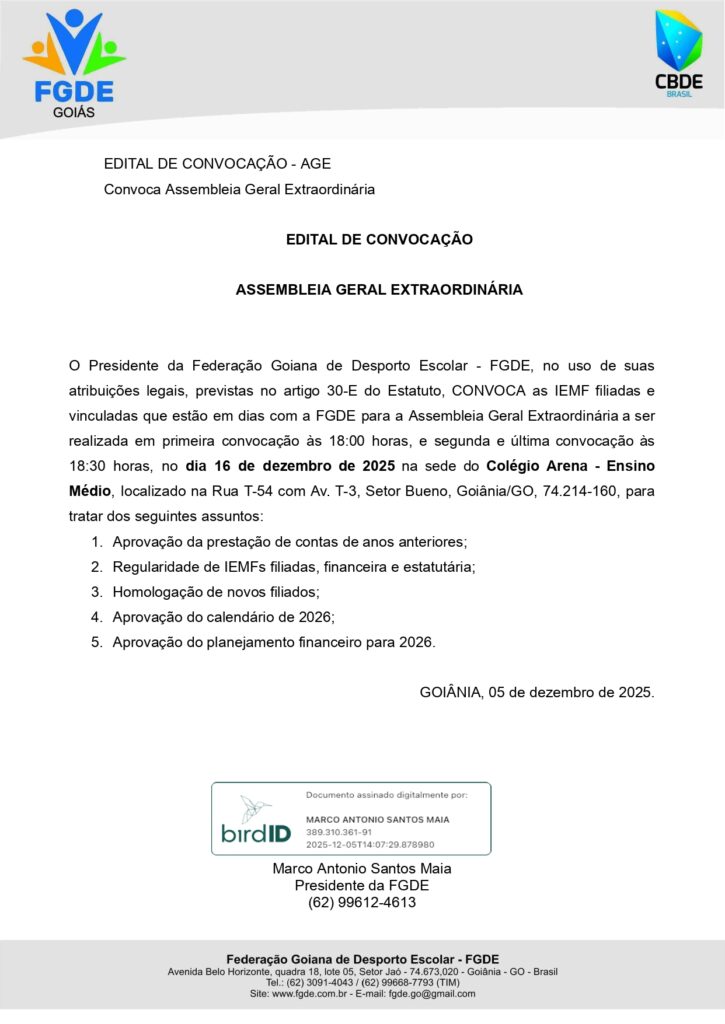 A Federação Goiana de Desporto Escolar (FGDE) informa que realizará uma Assembleia Geral na próxima terça-feira, 16 de dezembro, com primeira chamada às 18h e segunda chamada às 18h30. O encontro ocorrerá no Colégio Arena, em Goiânia, conforme solicitação formal enviada à instituição.